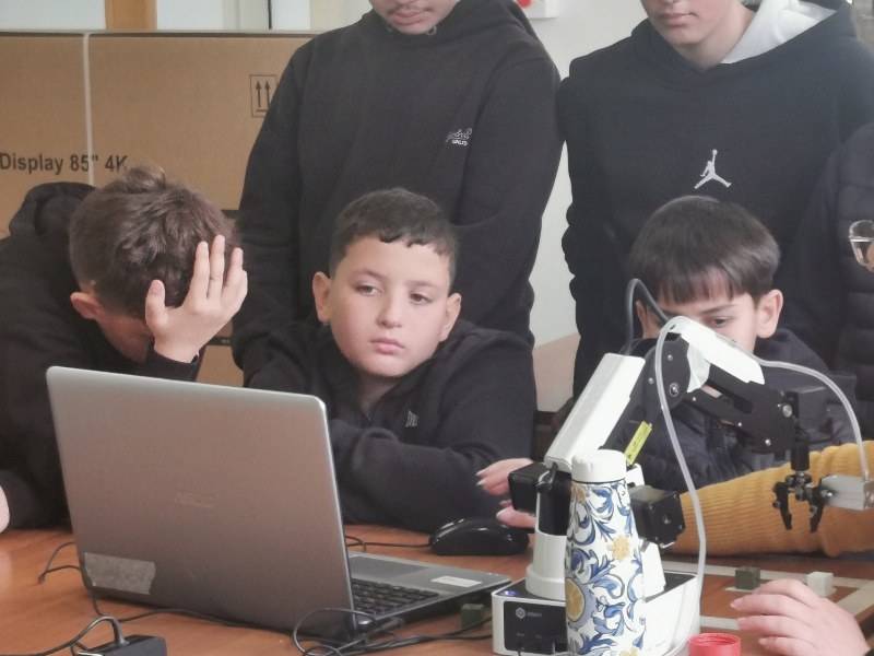 Στη 1η ενότητα οι μαθητές/τριες είχαν την ευκαιρία να έρθουν σε επαφή με ένα πιο ανεπτυγμένο περιβάλλον εκπαιδευτικής ρομποτικής από τα υφιστάμενα στο εργαστήριο του μαθήματος. Στη συγκεκριμένη δραστηριότητα ο στόχος ήταν να προγραμματίσουν ένα ρομποτικό βραχίονα με σκοπό την επίλυση ενός υποθετικού προβλήματος ανύψωσης και μεταφοράς φορτίων από ένα αυτόματο σύστημα.